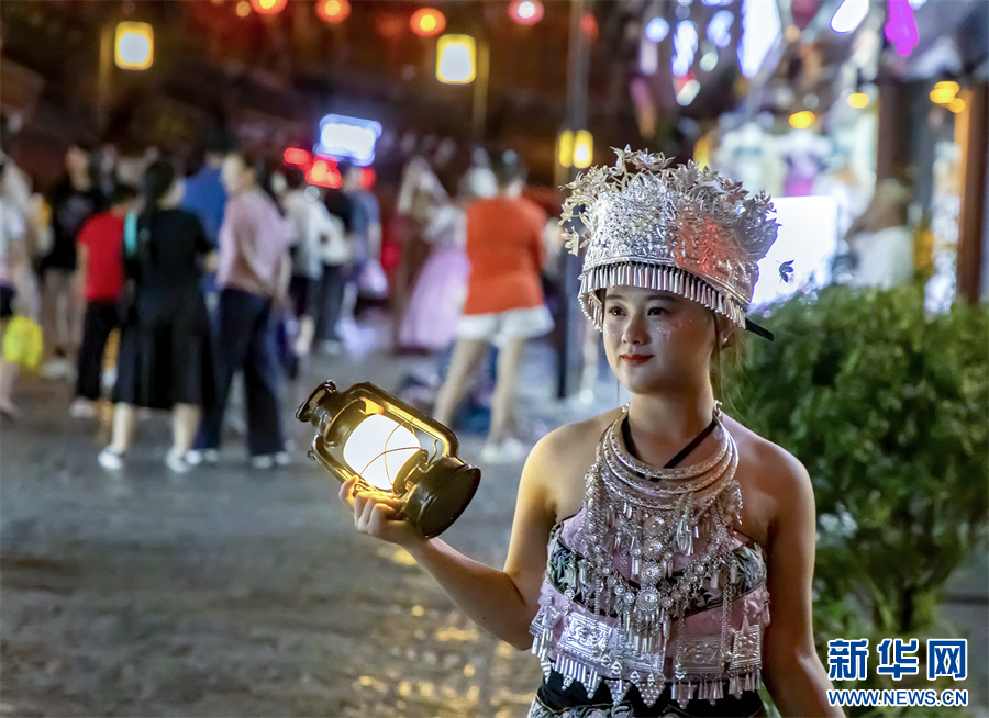 6月30日,身着苗族服饰的游客在贵州省都匀市石板街拍照游玩。新华网发(秦德福 摄)