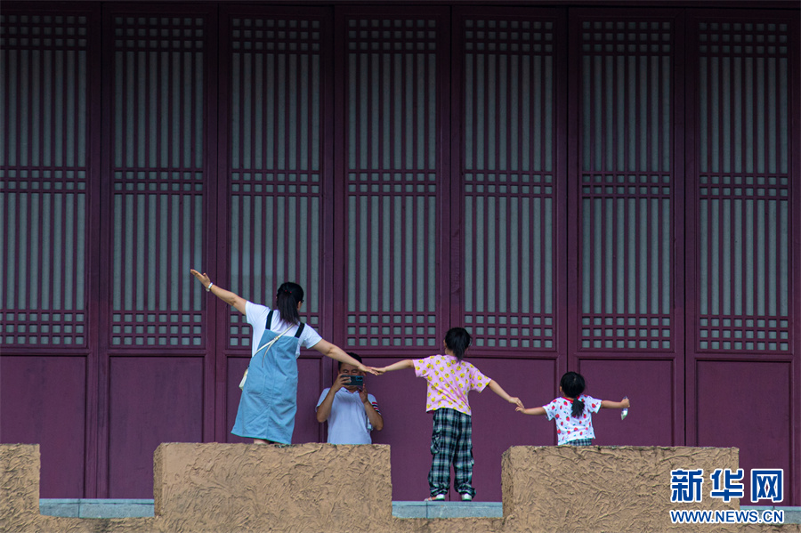 7月2日,游客在贵州省都匀市秦汉影视城宣室殿外拍照。新华网发(秦德福 摄)