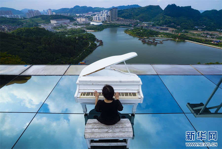 6月30日,游客在贵州省都匀市杉木湖景区“天空之境”弹钢琴。新华网发(李晓果 摄)