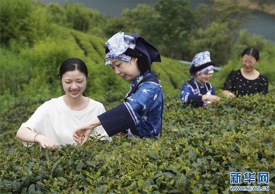 7月1日,茶农在贵州省都匀市毛尖镇坪阳村茶山采摘茶青。新华网发(钱力 摄)