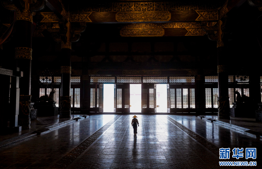 7月2日,身着汉服的工作人员从贵州省都匀市秦汉影视城宣室殿走过。新华网发(李晓果 摄)