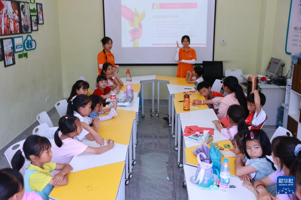 柏杨林街道,前来三下乡的大学生向孩子们授课(7月13日摄)。新华社记者 刘续 摄