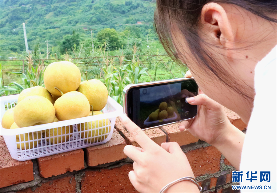 在赤水市大同镇民族村梨园里,游客拍摄翠冠梨。新华网发(张浪摄)