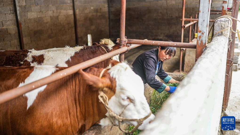 贵州威宁彝族回族苗族自治县雪山镇村民文惠在自家的牛舍里投喂青草(7月13日摄)。新华社记者 陶亮 摄
