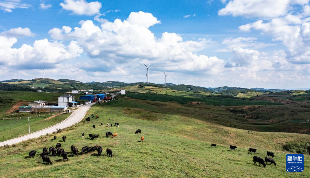 贵州威宁彝族回族苗族自治县雪山镇村民饲养的牛在风力发电设备下的草场吃草(7月13日摄,无人机照片)。