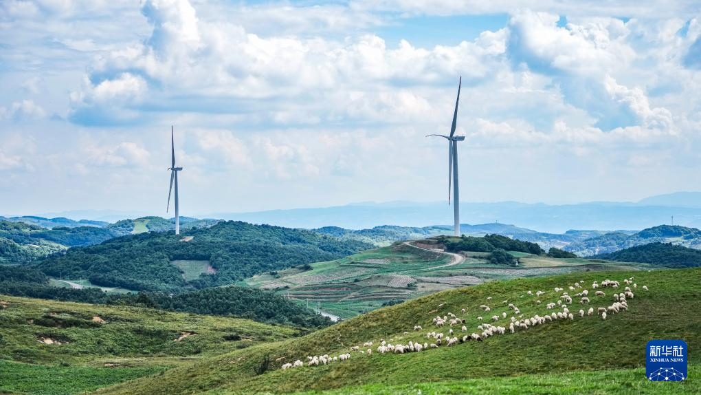贵州威宁彝族回族苗族自治县雪山镇村民饲养的羊群在风力发电设备下的草场吃草(7月13日摄)。新华社记者 陶亮 摄