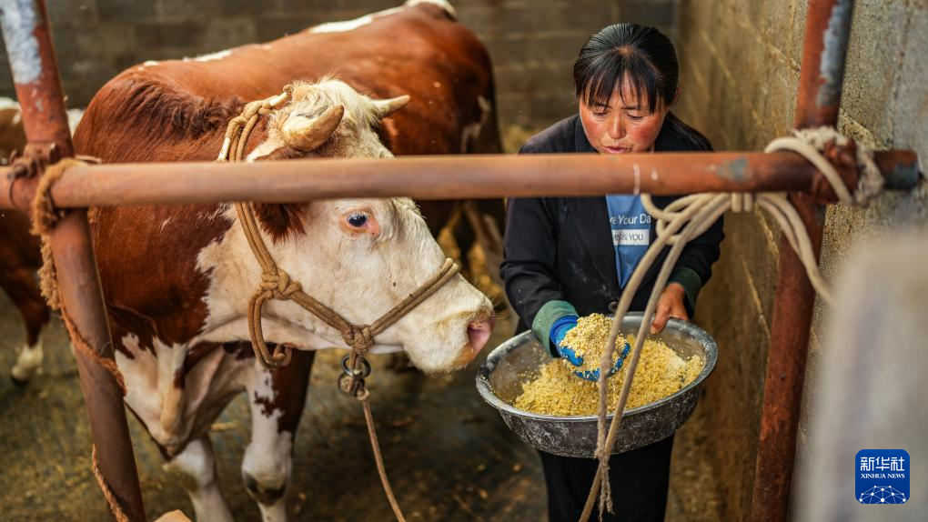贵州威宁彝族回族苗族自治县雪山镇村民文惠在自家的牛舍里投喂饲料(7月13日摄)。新华社记者 陶亮 摄