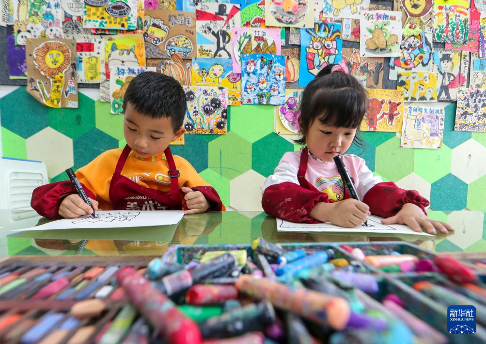7月19日,孩子们在贵州省开阳县一家书画培训中心练习创意绘画。新华社发(袁福洪摄)