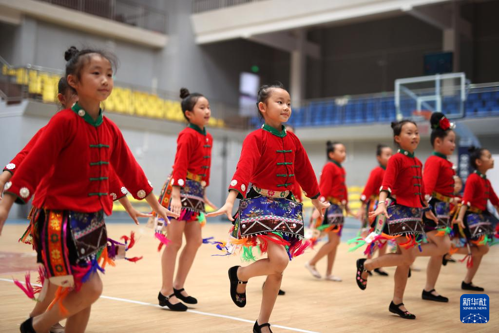 7月19日,孩子们在贵州省黔东南苗族侗族自治州丹寨县文化馆暑期免费舞蹈课上学习苗族非遗舞蹈“锦鸡舞”。