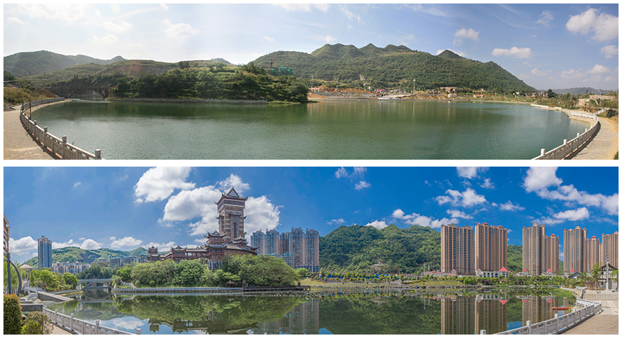 拼版照片:上图为2009年七星关区碧阳湖(2009年9月13日摄);下图为2017年七星关区碧阳湖(2017年5月8日摄)。新华网发(聂宗荣 摄)