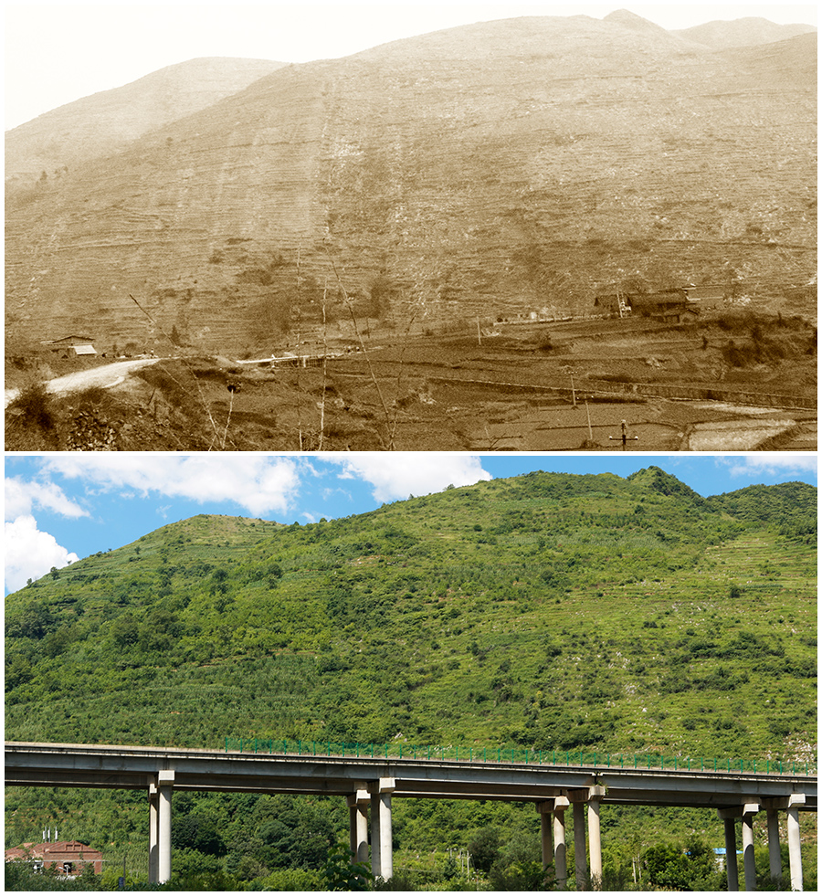 拼版照片:上图为1994年七星关区宋官水库严重水土流失;下图为七星关区宋官水库治理后重现青山(2017年7月23日摄)。新华网发(聂宗荣 摄)