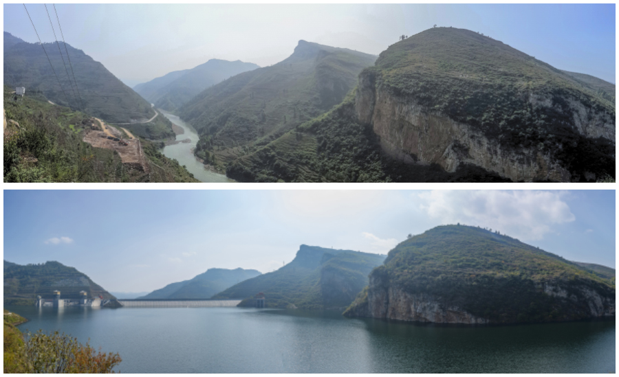 拼版照片:上图为2013年10月10日贵州夹岩水利枢纽工程动工前原始地貌;下图为2022年11月19日贵州夹岩水利枢纽工程建成储水至1305米水位。新华网发(聂宗荣 摄)