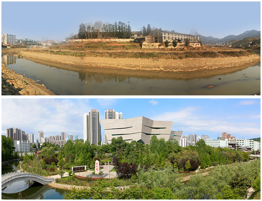 拼版照片:上图为2009年七星关区同心大厦的前身毕节原振兴机械厂(2009年2月12日摄);下图为2017年毕节同心城市公园同心大厦(原振兴机械厂)(2017年5月3日摄)。新华网发(聂宗荣 摄)