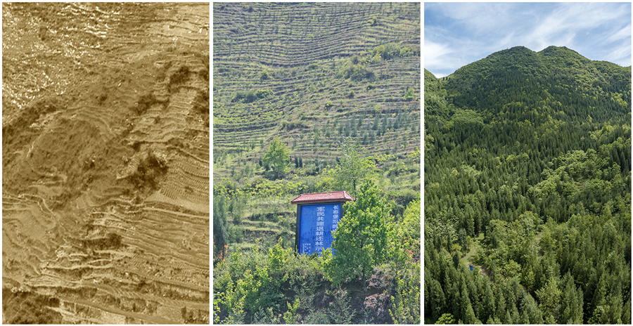拼版照片:左图为2002年七星关区阳鹊沟军民退耕还林示范点退耕还林前;中图为2007年七星关区阳鹊沟军民退耕还林示范点退耕还林后(2007年4月30日摄);右图为今日的阳鹊沟绿野青山,万亩林海郁郁葱葱(2018年5月14日摄)。新华网发(聂宗荣 摄)