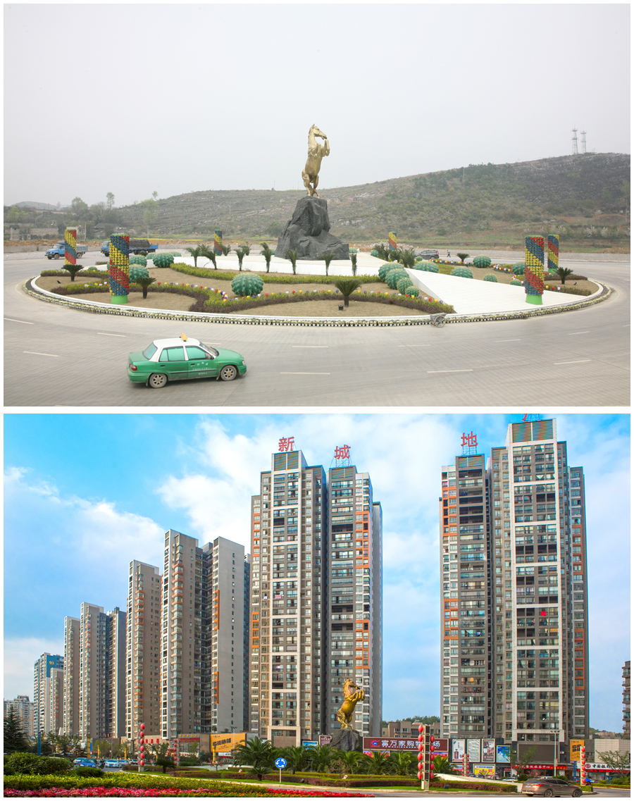 拼版照片:上图为2007年黔西市大转盘旧貌(2007年3月5日摄);下图为已成为城市中心的黔西市大转盘(2015年9月30日摄)。新华网发(聂宗荣 摄)
