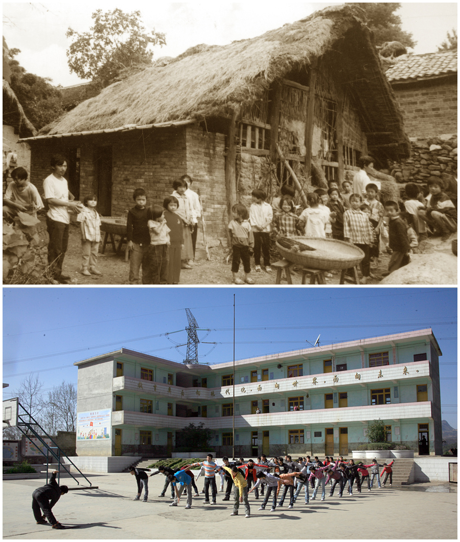 拼版照片:上图为1998年9月大方县小屯乡朱场小学旧貌。下图为2008年2月大方县小屯乡朱场小学新貌。新华网发(聂宗荣 摄)