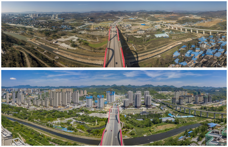 拼版照片:上图为2018年4月2日建设中的七星关区德溪新区;下图2022年7月12日建设中的七星关区德溪新区。新华网发(聂宗荣 摄)
