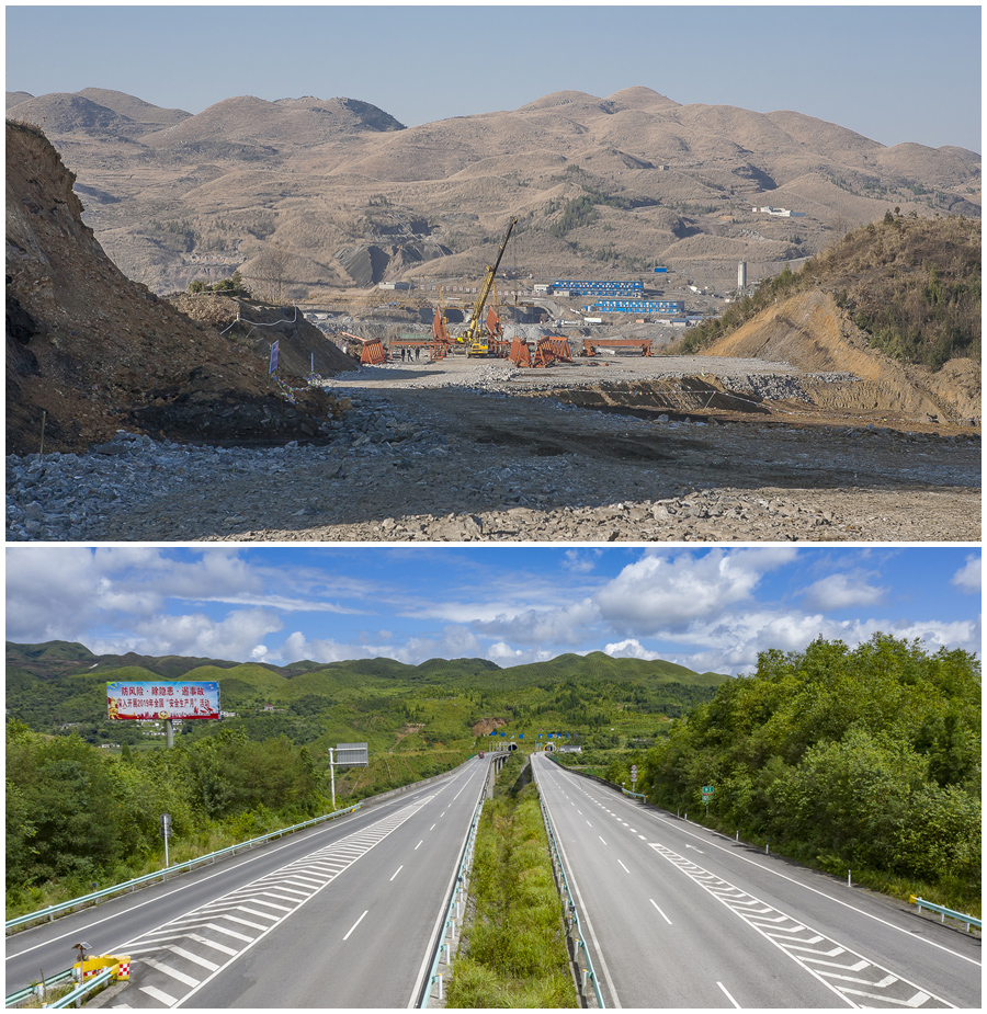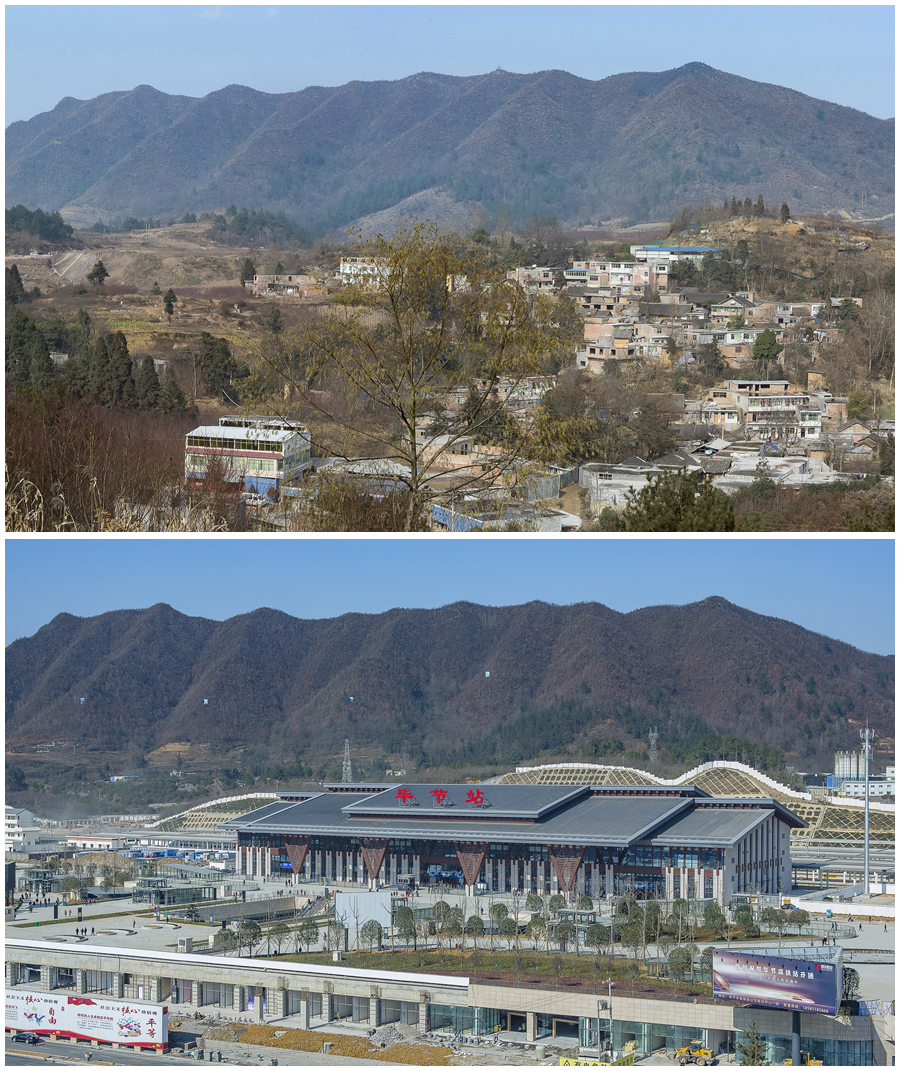 拼版照片:上图为成贵高速铁路毕节站动工前的山村(2014年1月17日摄);下图为成贵高速铁路正式运营,毕节站投入使用(2019年12月16日摄)。新华网发(聂宗荣 摄)