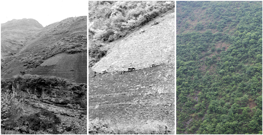 拼版照片:左图为30多年前位于赤水河流域的七星关区田坎乡陡坡开荒原貌(翻拍照片);中图为陡坡开荒原貌放大图(翻拍照片);右图为经过退耕治理后的七星关区田坎乡陡坡开荒地生态得以恢复(2013年4月25日摄)。新华网发(聂宗荣 摄)
