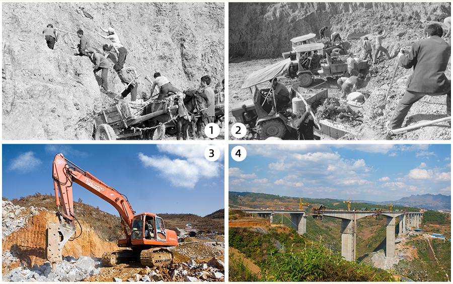 拼版照片:图1为20世纪80年代末期人挖马拉修建大(贵州大方)纳(四川纳溪)公路(翻拍照片);图2为20世纪90年代末期人挖手扶拖拉机拉修建贵毕高等级公路毕节东出口段(翻拍照片);图3为本世纪初大型机械成为修建遵义至毕节高速公路主力设备(2010年12月16日摄);图4为本世纪初建设毕威高速公路七星河特大桥用上了国产最先进的架桥设备(2012年10月21日摄)。新华网发(聂宗荣 摄)