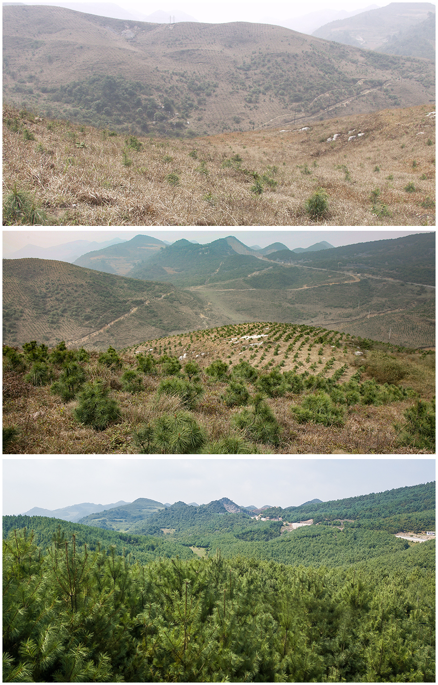 拼版照片:上图为地处乌江源头的威宁县盐仓镇最高峰马吃水海拔2446米,高寒缺水,是一片荒山秃岭,在国家生态防护林建设中采用营养袋育苗种植华山松(2005年4月14日摄);中图为威宁县最高峰马吃水营养袋育苗(2007年3月21日摄);下图为威宁县最高峰马吃水营养袋育苗已经成林,有效地减少了水土流失,保护了贵州的母亲河——乌江(2017年9月13日摄)。新华网发(聂宗荣 摄)