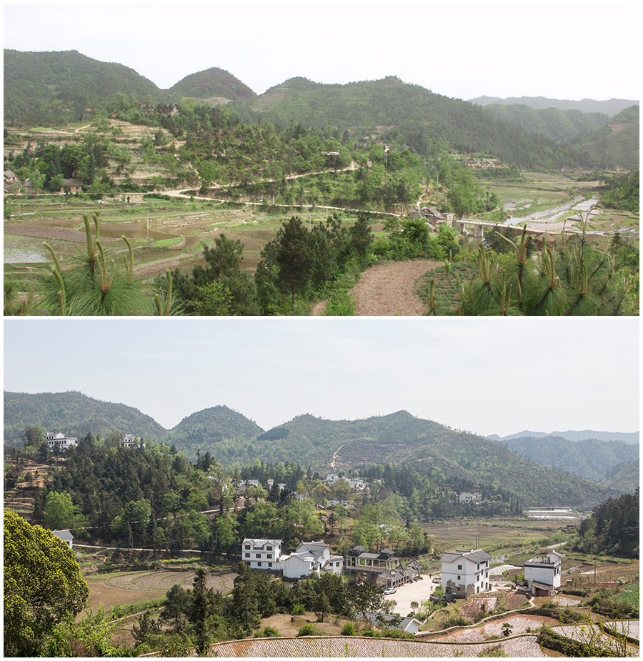 拼版照片:上图为2004年民盟中央帮扶七星区关梨树镇上小河村旧貌(2004年4月26日摄);下图为2013年民盟中央帮扶七星关区梨树镇上小河村新貌(2013年3月24日摄)。新华网发(聂宗荣 摄)