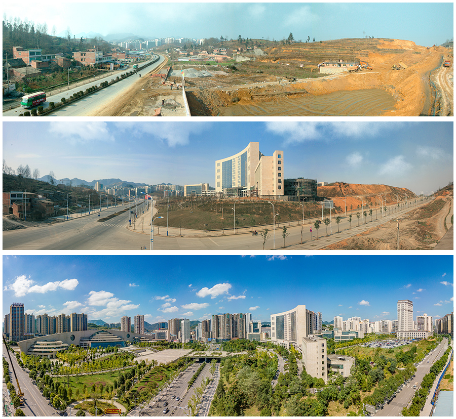 拼版照片:上图为七星关区南部新区在大兰村动工(2006年1月10日摄);中图为七星关区南部新区市行政办公中心主体工程基本完工(2009年2月12日摄);下图为七星关区南部新区成为毕节市政治、经济、商业、文化中心(2017年10月9日摄)。新华网发(聂宗荣 摄)
