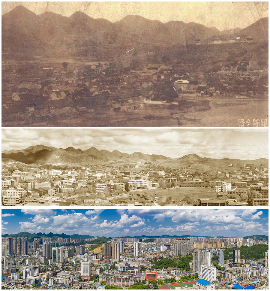 拼版照片:上图为1948年毕节全景(翻拍照片);中图为1985年毕节县城区全景;下图为2023年七星关区(原毕节县)老城区全景(2023年6月25日摄)。新华网发(聂宗荣 摄)