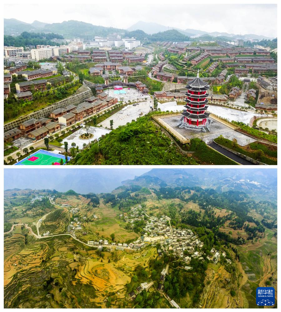 拼版照片:上图为2019年6月6日拍摄的贵州省晴隆县阿妹戚托小镇(无人机照片,新华社记者 杨文斌 摄);下图为2017年拍摄的搬迁前的晴隆县三宝彝族乡(无人机照片,新华社发 文森摄)。新华社发