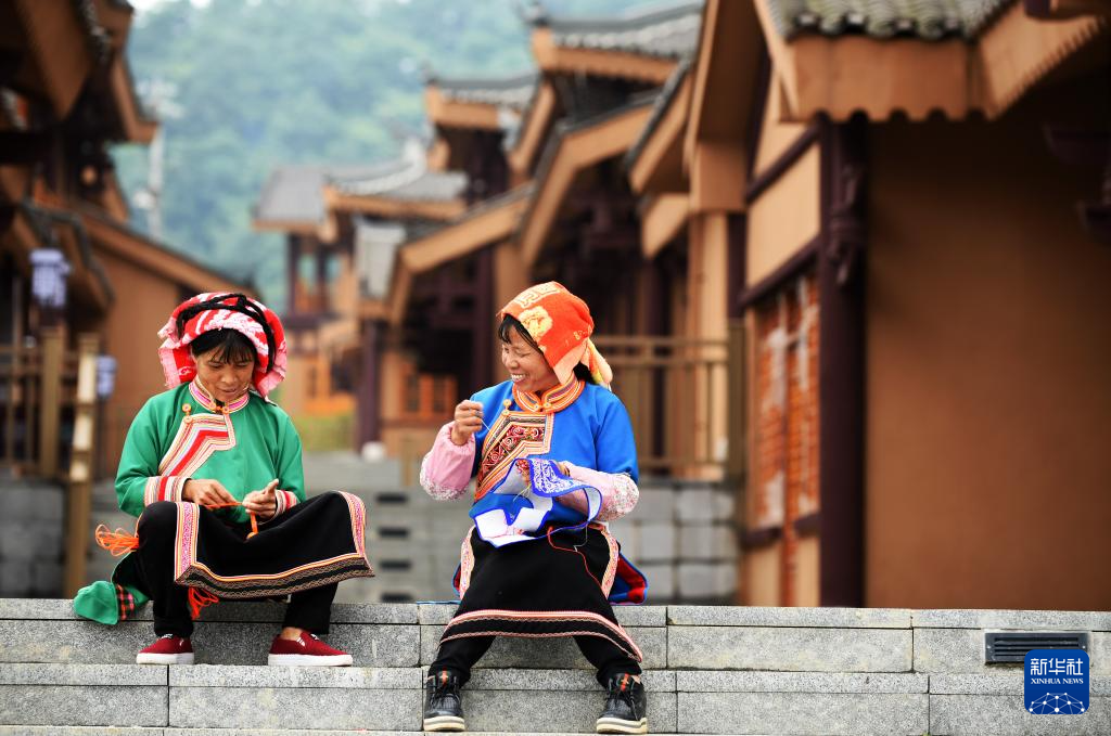 来自贵州省晴隆县三宝彝族乡的两名搬迁群众在阿妹戚托小镇易地扶贫搬迁安置点刺绣(2019年6月6日摄)。新华社记者 杨文斌 摄