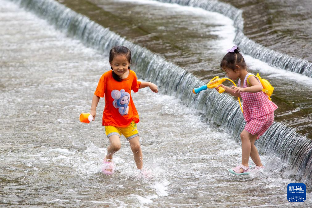 7月23日,小朋友在贵州省安顺经济技术开发区幺铺镇十里荷廊风景区戏水玩耍。