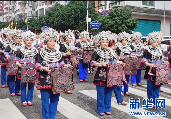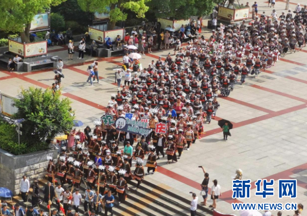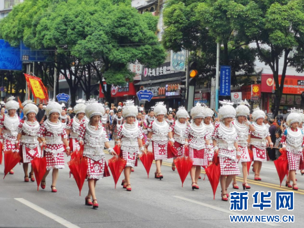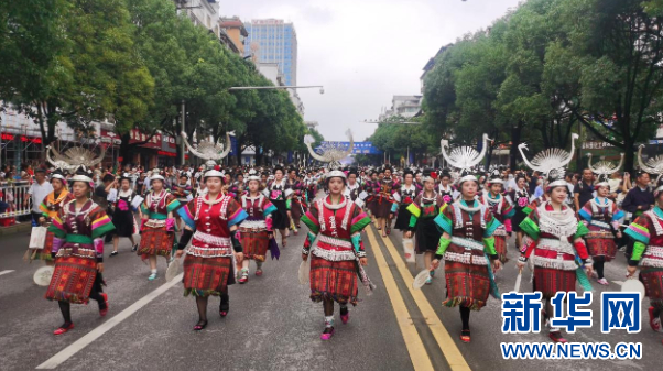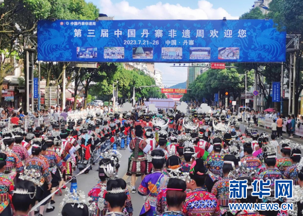 7月23日,在第三届中国丹寨非遗周“非遗盛装巡演”活动中,来自贵州省黔东南苗族侗族自治州各县(市)的各族群众4100余人,身着各自的民族盛装,载歌载舞,巡游丹寨县城,向游客展示非遗盛装的独特魅力。