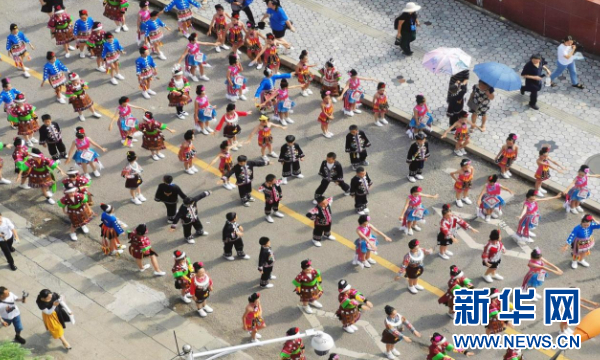 身着民族服装,载歌载舞的小朋友队伍。新华网发(戴佳玥 摄)