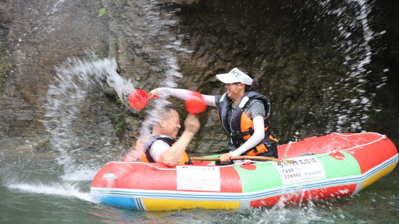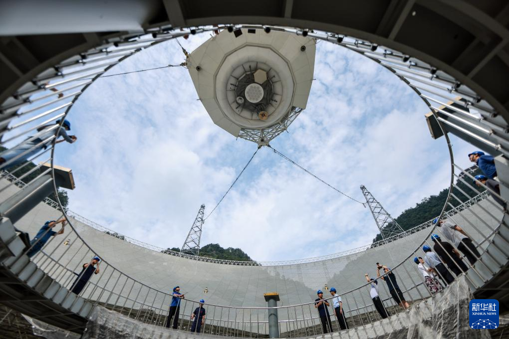7月26日,专家在“中国天眼”馈源舱前进行现场考察(维护保养期间拍摄)。新华社记者 欧东衢 摄