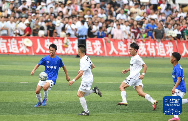7月29日,新中村足球队球员(左一)和场坝村足球队球员在“村超”三四名争夺战中拼抢。新华社记者 杨文斌 摄