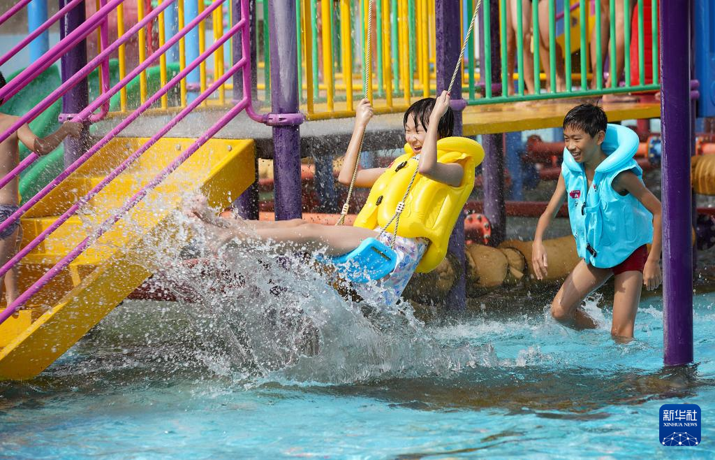 7月29日,孩子们在贵州省黔东南苗族侗族自治州丹寨县扬武镇乡村水上乐园玩水。新华社发(黄晓海 摄)