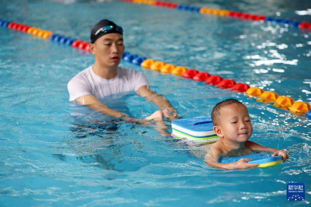 7月30日,在贵州省黔东南苗族侗族自治州丹寨县一家游泳馆,教练指导小学员学习正确的游泳姿势。新华社发(杨胜贤摄)