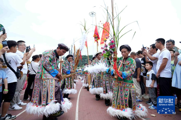 6月23日,村民自发组成的民族歌舞表演队盛装吹芦笙入场。新华社发(王炳真摄)