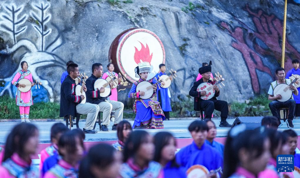 演员在威宁彝族回族苗族自治县火把节活动上演奏月琴(8月10日摄)。新华社记者 陶亮 摄