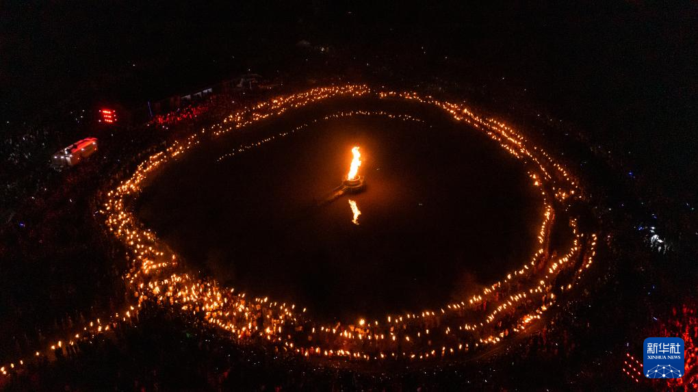 这是威宁彝族回族苗族自治县板底乡的篝火晚会现场(8月10日摄,无人机照片)。新华社记者 陶亮 摄
