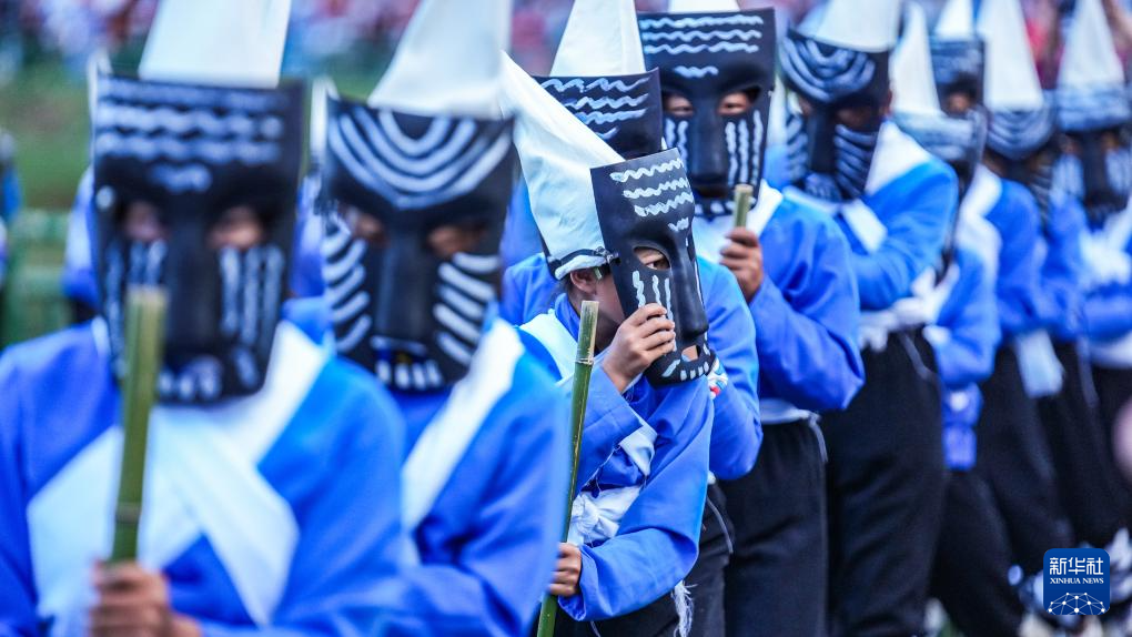 小朋友在火把节活动上表演彝族传统戏剧“撮泰吉”(8月10日摄)。新华社记者 陶亮 摄