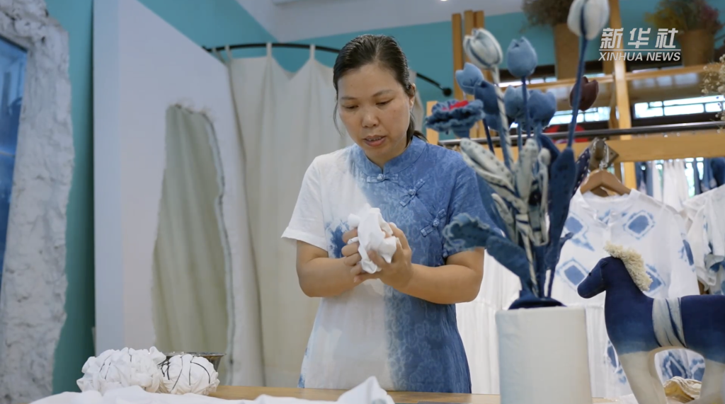 凭借着一双巧手,何茂晴在位于贵州省黔南布依族苗族自治州荔波县县城内的荔波古镇办起了一家扎染工坊并经营得有声有色,被贵州省妇女联合会评为贵州省锦绣计划巧手脱贫基地,在传承好民族技艺的同时,为当地妇女提供了在家门口就业的机会。