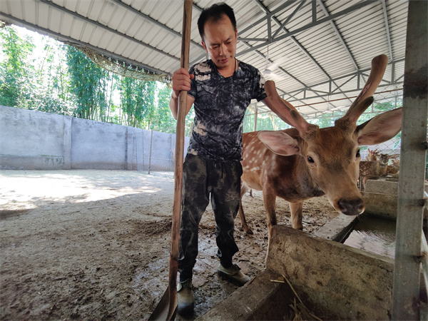 在赤水市旺隆镇胜丰村梅花鹿养殖基地,李明怀抚摸梅花鹿,察看其状态。(张浪摄)