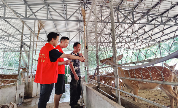 在赤水市旺隆镇胜丰村梅花鹿养殖基地,干部和李明怀(左一)察看梅花鹿生长情况。(张浪摄)