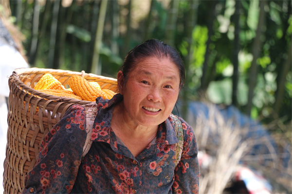 在赤水市旺隆镇胜丰村梅花鹿养殖基地,李明怀的母亲袁国福背着新鲜的玉米。(张浪摄)
