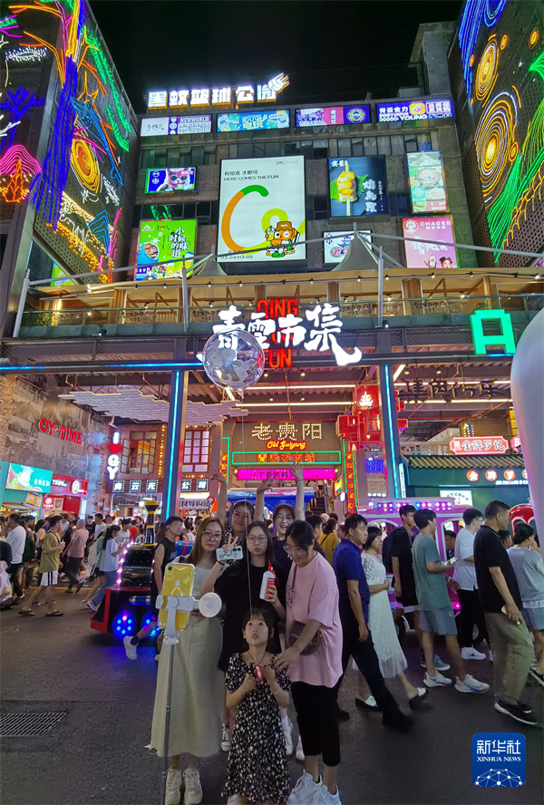 霓虹灯牌点亮街巷夜空,人群穿梭激活城市夜经济。在由老厂区改造而成的贵阳青云市集,今年暑期日均人流量超4.5万人次,较平时增长约50%。餐饮、娱乐、文创三种业态交织融合,贵州知名的餐饮品牌和非遗文创店吸引大量游客慕名而来。