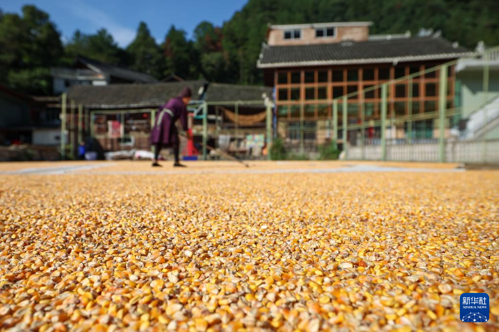 8月30日,贵州省黔东南苗族侗族自治州丹寨县扬武镇龙塘村村民在晾晒玉米。新华社发(杨胜贤 摄)