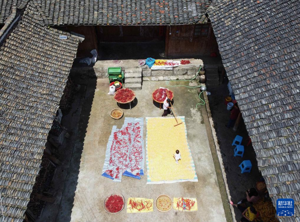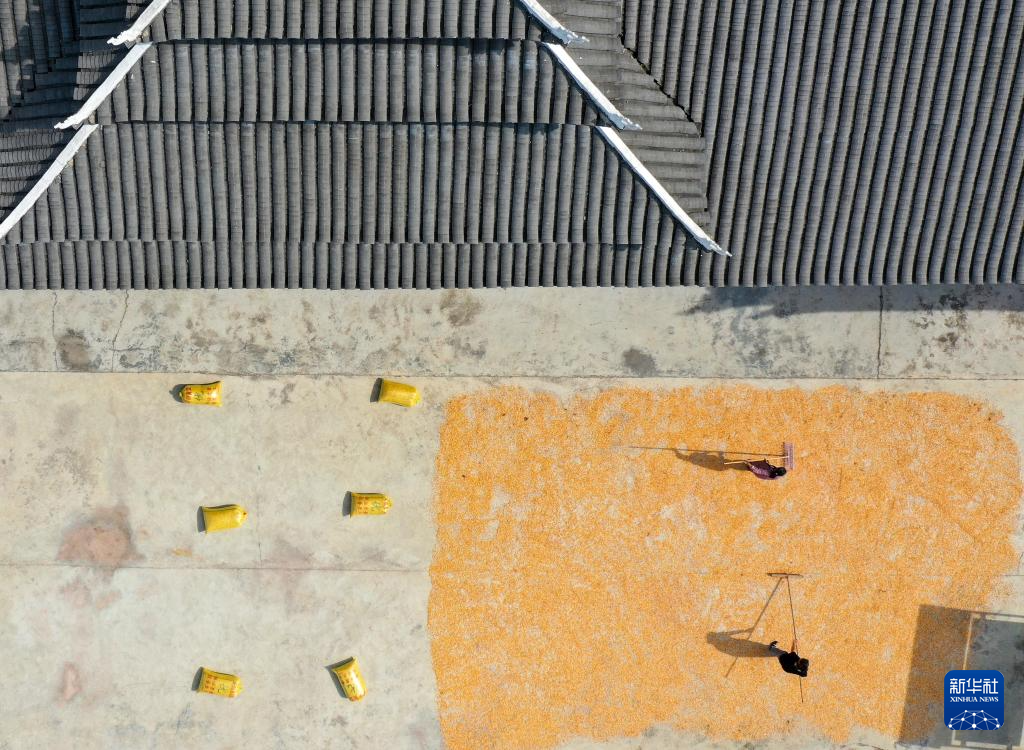 8月29日,贵州省铜仁市玉屏侗族自治县亚鱼乡郭家湾村农民在翻晒收获的玉米(无人机照片)。新华社发(胡攀学 摄)