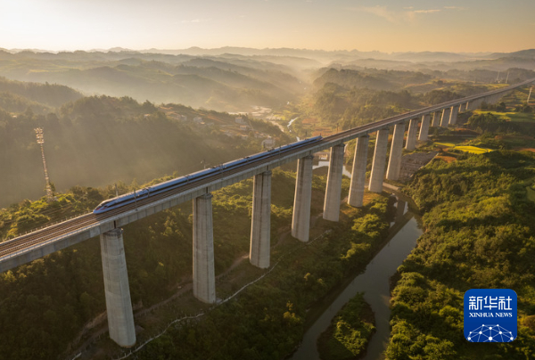 8月31日,一列动车组在晨曦中经过位于贵州省独山县郊外的贵南高铁银坡河特大桥(无人机照片)。新华社记者 刘续 摄
