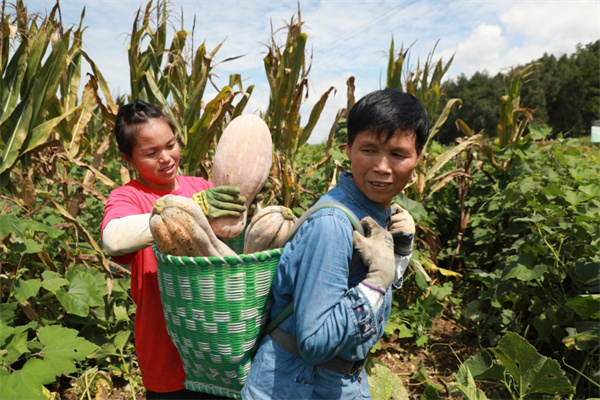 村民将采收的南瓜装进背篓。(李昌焯 摄)